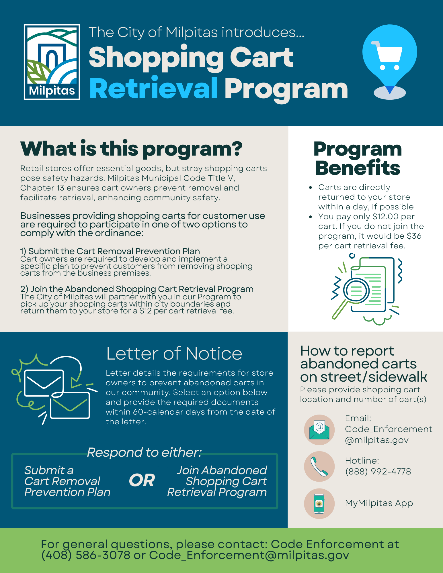 The shopping cart ordinance, Milpitas Municipal Code Title V, Chapter 13 requires business cart owners to be responsible to prevent the removal of carts from premises and to facilitate the retrieval of abandoned carts. Businesses providing shopping carts for customer use are required to participate in one of two options to comply with the ordinance: