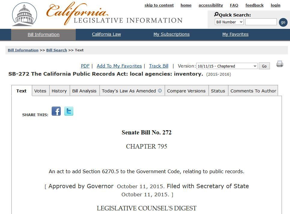 Approved on October 11, 2015, adds a section to the California Public Records Act requiring local agencies to create a catalog of Enterprise Systems by July 1, 2016, with annual updates.